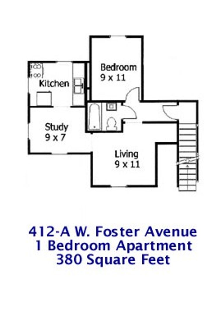 This one bedroom apartment is located on the second floor of 412 W. Foster Ave. and features a private entrance from the side staircase.